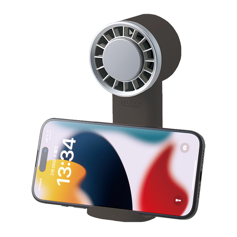 風量は弱・中・強の3段階、付属のスタンドにセットすればデスクファンとしても使用できます。(スタンドはスマホスタンドとしても使用可能!)